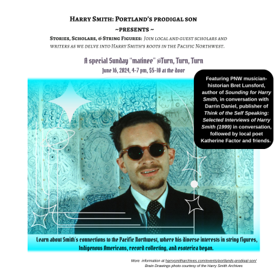 Sun, June 16: Turn, Turn, Turn, 4-7 pm. Harry Smith and the PNW: Stories, Scholars, and String Figures. Join local and guest scholars and writers for an afternoon "matinee" that delves into Harry Smith’s roots in the Pacific Northwest. Meet PNW musician-historian Bret Lunsford, author of Sounding for Harry Smith and Portlander friend of Harry Smith, and Darrin Daniel, publisher of Think of the Self Speaking: Selected Interviews of Harry Smith (1999) in conversation, followed by jazz scholars, and then poets Katherine Factor, Laurence Lilvik, and Christopher Luna. Learn about Smith’s connections to the Pacific Northwest, where his diverse interests in string figures, Native Americans, record collecting, and esoterica began. Sponsored by PDXJazz. $5-$10 suggested donation.